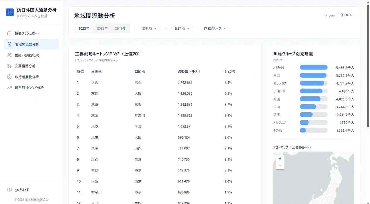 国土交通省が公表するFF-Data(外国人流動データ)と法務省の出入国管理統計という2つの公的統計を組み合わせ、訪日外国人の動態を6つの分析ビューで可視化します。都道府県別の来訪者数や国籍別シェアを一覧で把握できる概要ダッシュボードから、出発地と目的地の移動パターンをフローマップで視覚的に確認できる地域間流動分析まで、訪日外国人の「流れ」を直感的に理解できるダッシュボードです。 |