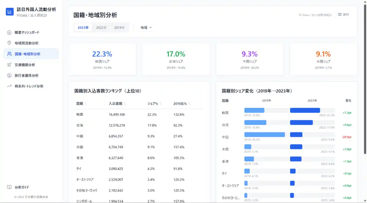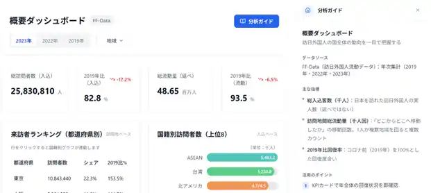 FF-Dataは2022年・2023年の年次データ、出入国管理統計は2024年、2025年のデータ、コロナ前との比較用としてそれぞれ2019年のデータを含む形で搭載しています。 |