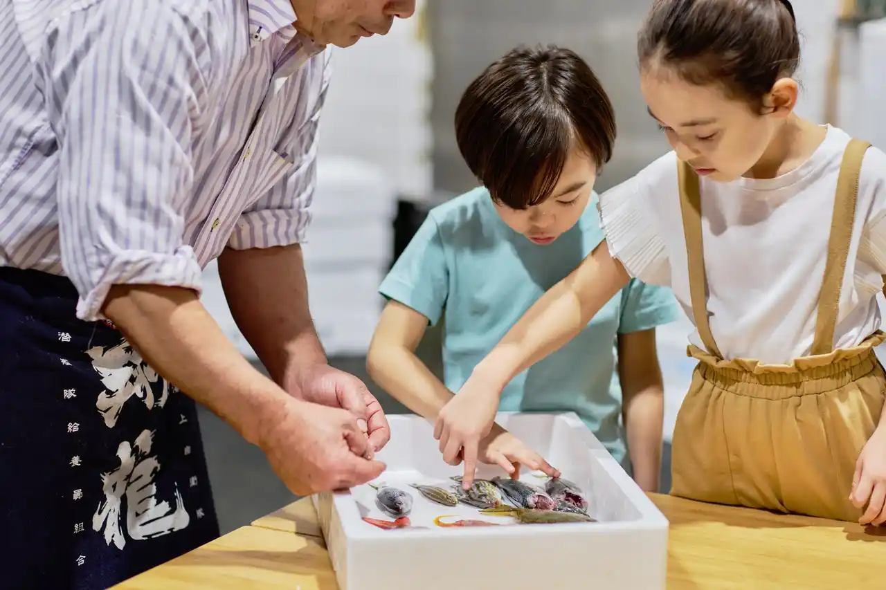 含まれるもの:魚屋によるレクチャー、漁体験、競り体験、調理体験、ランチプレート、ワークシート |