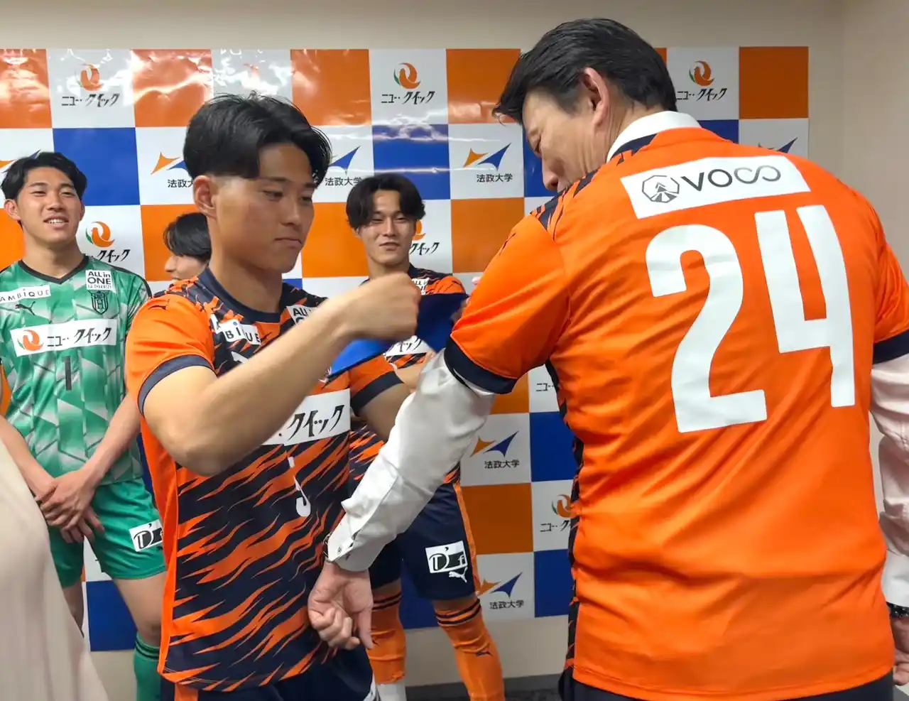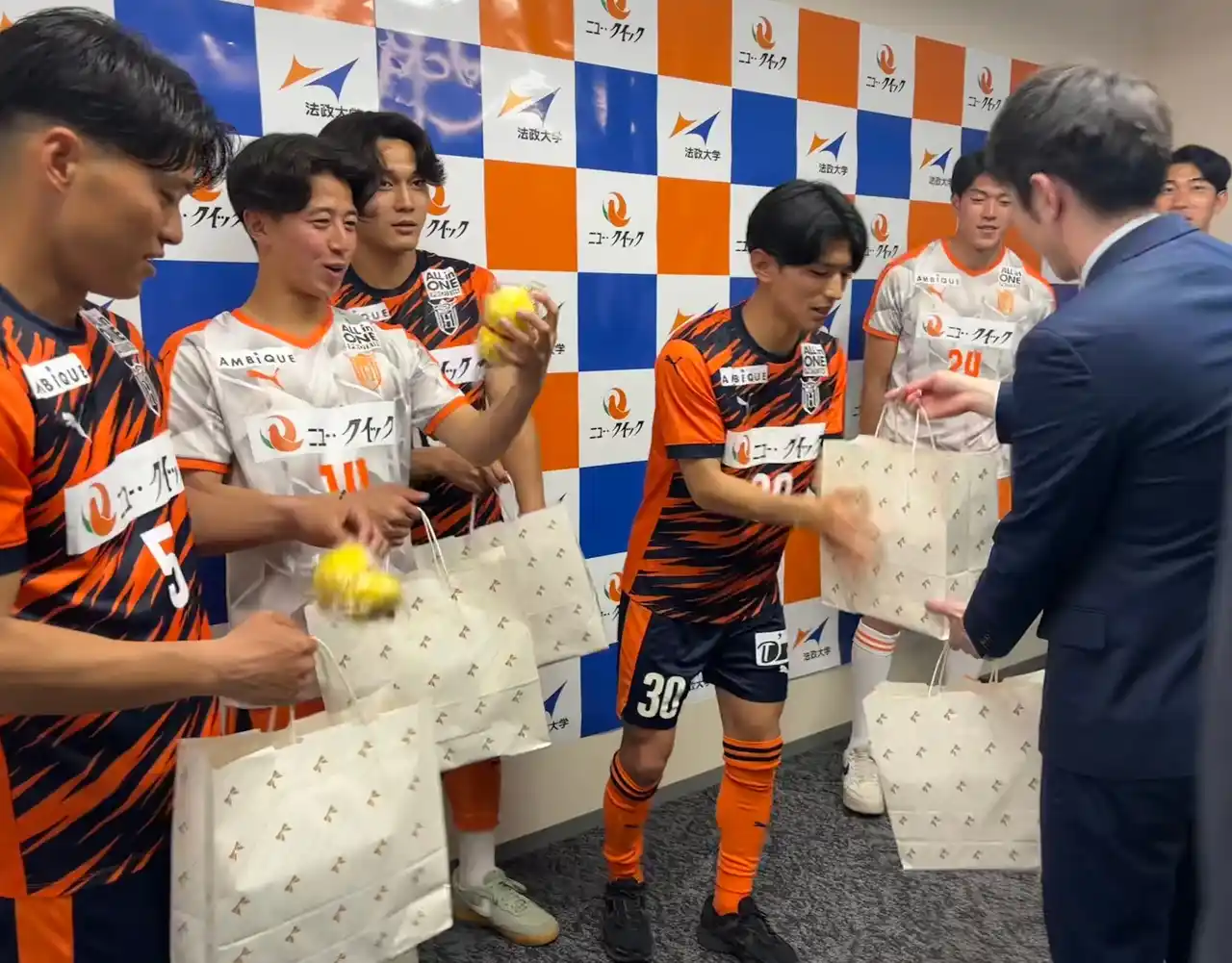 記念撮影では、法政大学体育会サッカー部のご協力のもとユニフォームを用いた撮影も行われ、林もキャプテンマークを着用させていただくなど、終始笑顔の絶えないひとときとなりました。また、ニュー・クイックの公式キャラクター「クイッピー」も登場し、会場は和やかな雰囲気に包まれました。あわせて、選手の皆さまへお土産としてニュー・クイックオリジナルカレーセットとクイッピーのぬいぐるみを贈呈しました。 |