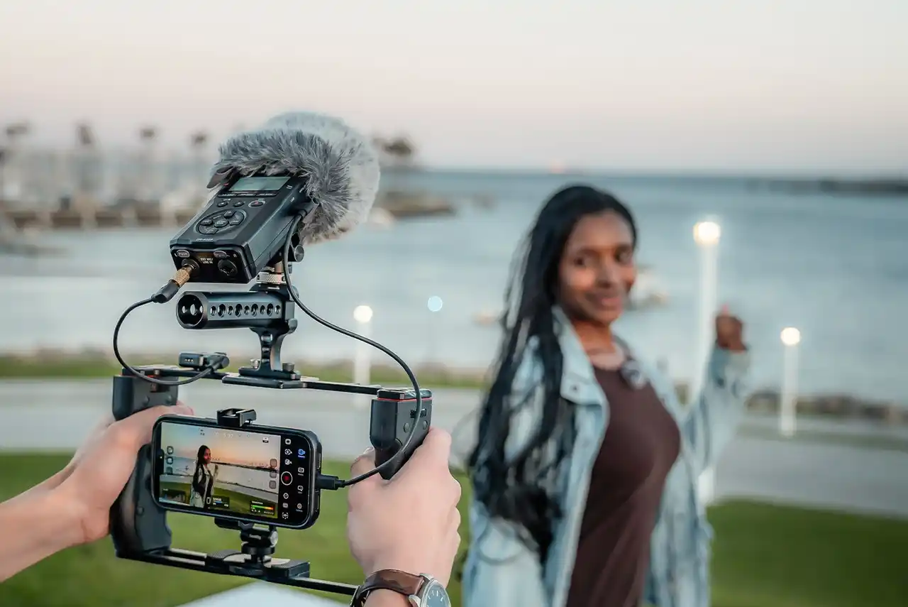 映画、YouTube、Vlogなど映像のルックに合わせた音像表現ができる可動式マイクを搭載。X-Y方式はインタビューやVlogに適したフォーカスのあるクリアな音を、A-B方式は音楽やロケ地の空気感まで立体的に捉えます。XLR/TRS外部入力を備え、お気に入りのマイクにも対応。音声と映像の同期を助ける高精度クロックやトーン出力、3.5mmステレオライン出力などスムーズにカメラと連携でき、映像作品のクオリティを引き上げます。 |