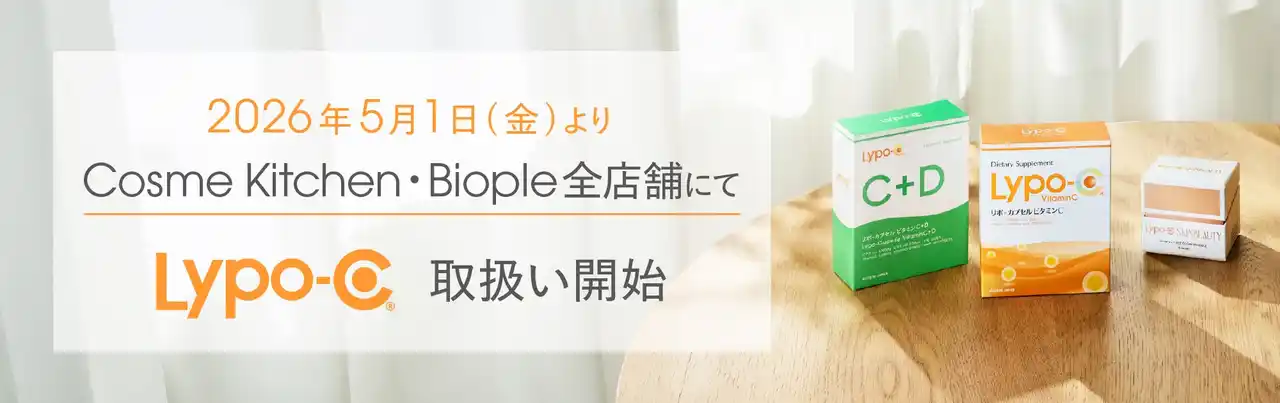 株式会社スピック(本社:神奈川県鎌倉市、代表取締役社長:芝田崇行)は、リポソーム型ビタミンCサプリメント「Lypo-C(リポシー)」およびスキンケアブランド「Lypo-C SKINBEAUTY」を、ナチュラル&オーガニックコスメのセレクトショップ「Cosme Kitchen(コスメキッチン)」「Biople(ビープル)」「Biop(ビオップ)」※の全店舗およびWEB STOREにて、2026年5月1日(金)より販売開始いたします。また、販売開始を記念し、「Lypo-C」の人気製品を組み合わせた数量限定の特別セットも発売いたします。 |
