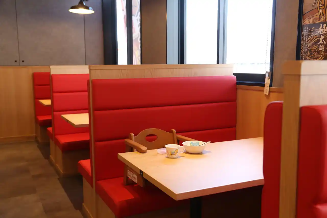 3. 家族で楽しめる店舗設計|4人席、お子さま椅子完備。清潔感のある明るい店内とオープンキッチン