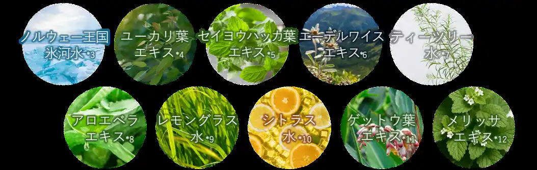 *6 エーデルワイス花/葉エキス(保湿) *7 ティーツリー葉エキス(保湿) *8 アロエベラ葉エキス(保湿) *9 レモングラス葉/茎エキス(保湿) *10 ユズ果実エキス(保湿) *11 ゲットウ葉エキス(保湿) *12 メリッサ葉エキス(保湿) |