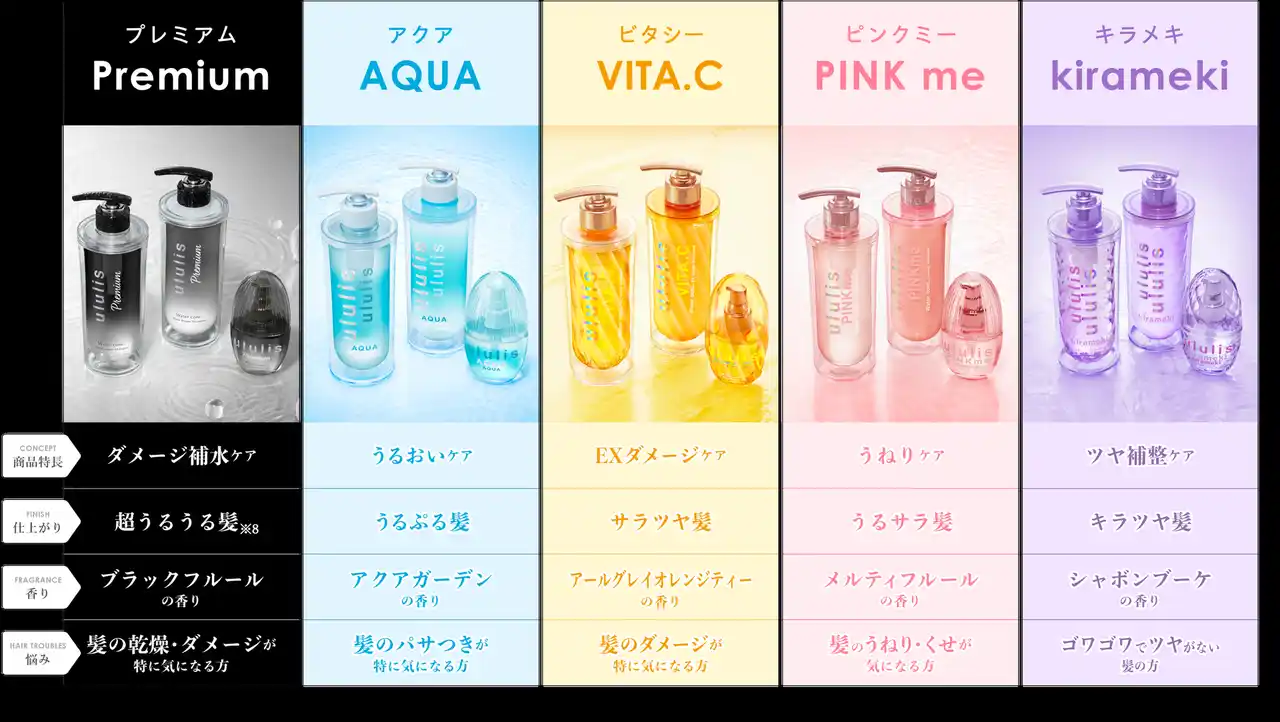 うるおいケアの「AQUA(アクア)」、EXダメージケアの「VITA.C(ビタシー)」、うねりケアの「PINKme(ピンクミー)」、ツヤ補整ケアの「kirameki(キラメキ)」、ダメージ補水ケアの「Premium(プレミアム)」の5シリーズ展開。 |