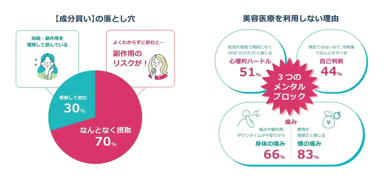 なぜ、これほど多くの人が一歩を踏み出せないのか。その背景には、日本が世界に誇る優れた公的医療保険制度があります。制度が充実しているからこそ、「病院は本当に治療が必要な人が行く場所」という認識が根付いているのです。この「美容のために病院に行くのは大げさ」という真面目さからくる遠慮により、美容医療・美容内服への関心はありながらも、消費者は無防備な自己判断のセルフケアに追いやられています。 |