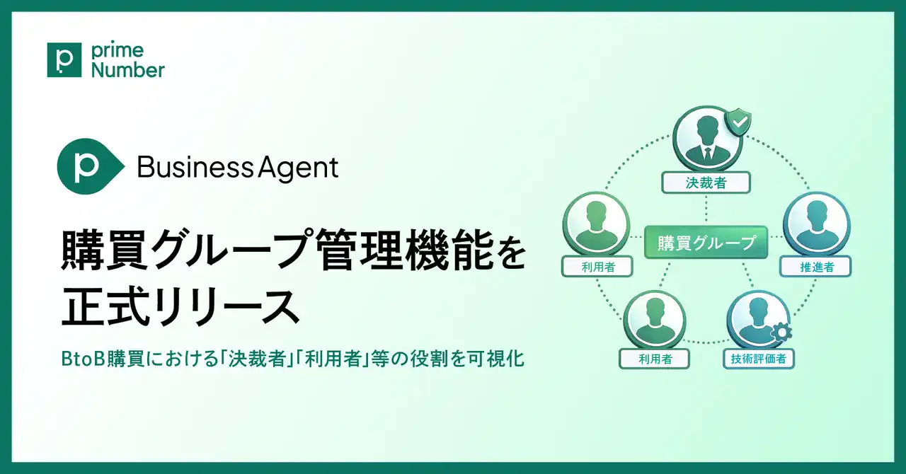 株式会社primeNumber(本社:東京都品川区、代表取締役CEO:田邊 雄樹)は、意思決定支援型AI「primeBusinessAgent」において、AIが行動データから購買関与者を自動でグルーピングし、「決裁者」「利用者」といった個人の役割を可視化する「購買グループ管理」機能を正式リリースします。これによりマーケターや営業は顧客の組織全体の購入意欲を把握した上で「いつ、誰に、どのように」コミュニケーションすべきかを的確に判断し、商談の成功確度を高めることが可能となります。なお、本機能について4月8日から10日に東京ビッグサイトで開催される「Japan IT Week 春 2026」にてご紹介いたします。 |
