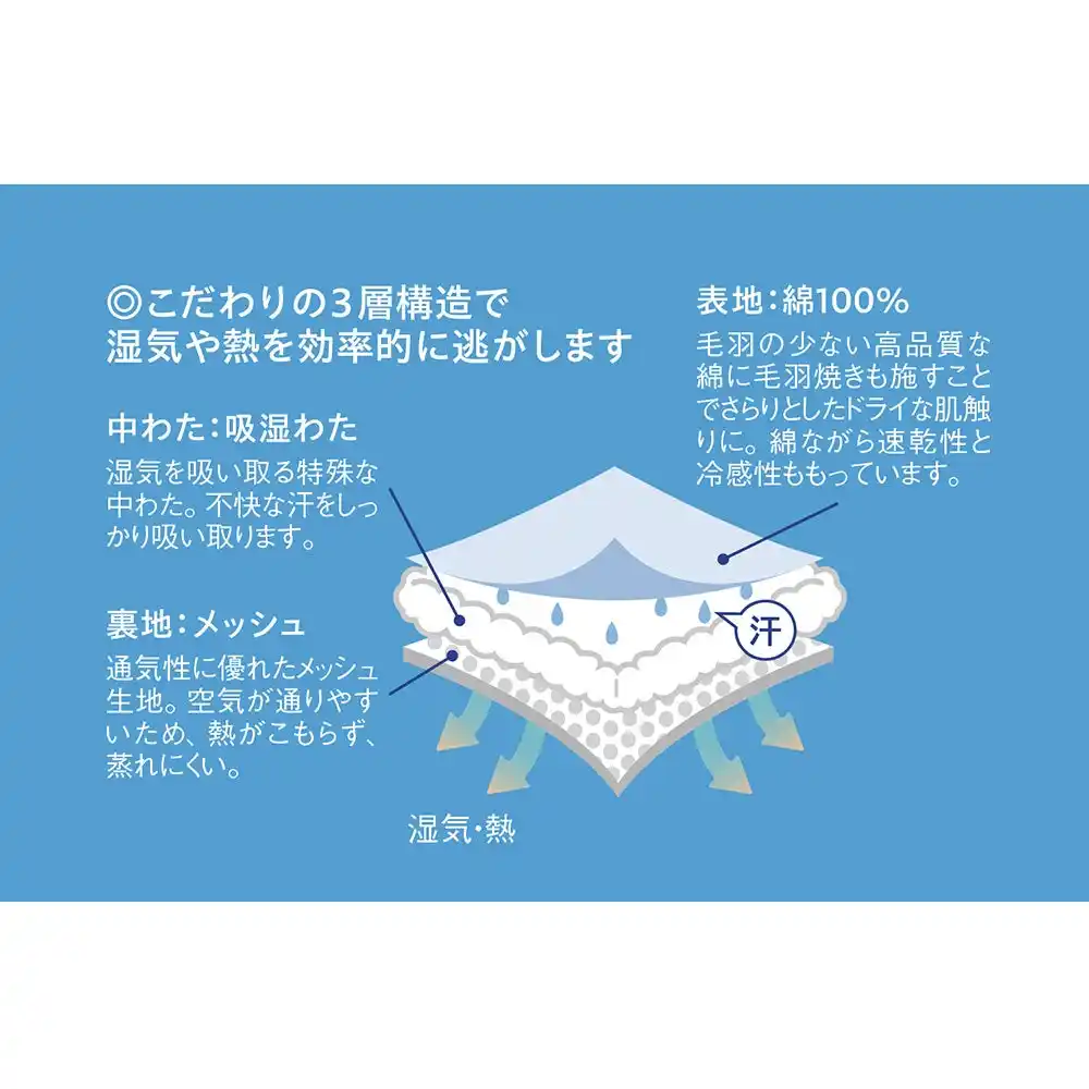 肌に触れる表面には、汗をしっかり吸収する綿100%の素材を採用しています。毛羽の少ない上質な綿の生地を使用し、さらに生地表面に毛羽焼き加工とシルケット加工を施し、表面をフラットに仕上げることで、心地よい肌触り・吸水速乾性・冷感性を実現しました。 |