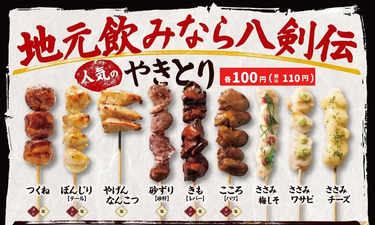 | 2024年で40周年を迎えた「炭火焼 八剣伝」は、炭火で丁寧に焼き上げた焼鳥を中心に、揚物、焼物、食事など多彩な居酒屋メニューを取り揃えています。地域密着型の店舗展開を行っており、郊外や繁華街など様々なロケーションでご利用いただけます。 | ||||||||||