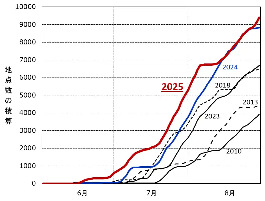全国のアメダス地点で観測された猛暑日の地点数も、2010年以降最高の9385地点を記録しました。 |