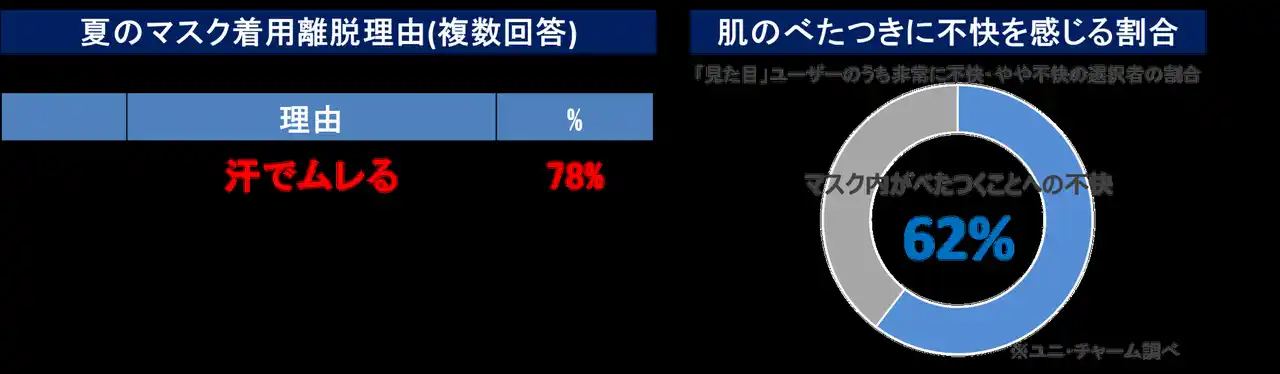 例年、夏はマスク着用時の「暑さ」や「ムレ」に対する不快感が高まる傾向にあります。当社の調査によると、夏にマスク着用を控える理由として「汗でムレる(78%)」が最も多く、次いで「暑い(76%)」「息苦しい(71%)」があげられています。また、カラーマスクを使用する「見た目」ユーザーのうち6割以上の方が、マスク内の汗ムレによって「肌のべたつき」に強い不快感を抱いています。「汗をかくと鼻周りのファンデーションが崩れる」「マスクが肌に張り付く」といった、美容面や身だしなみに関する悩みが今回の調査で浮き彫りになりました。 |