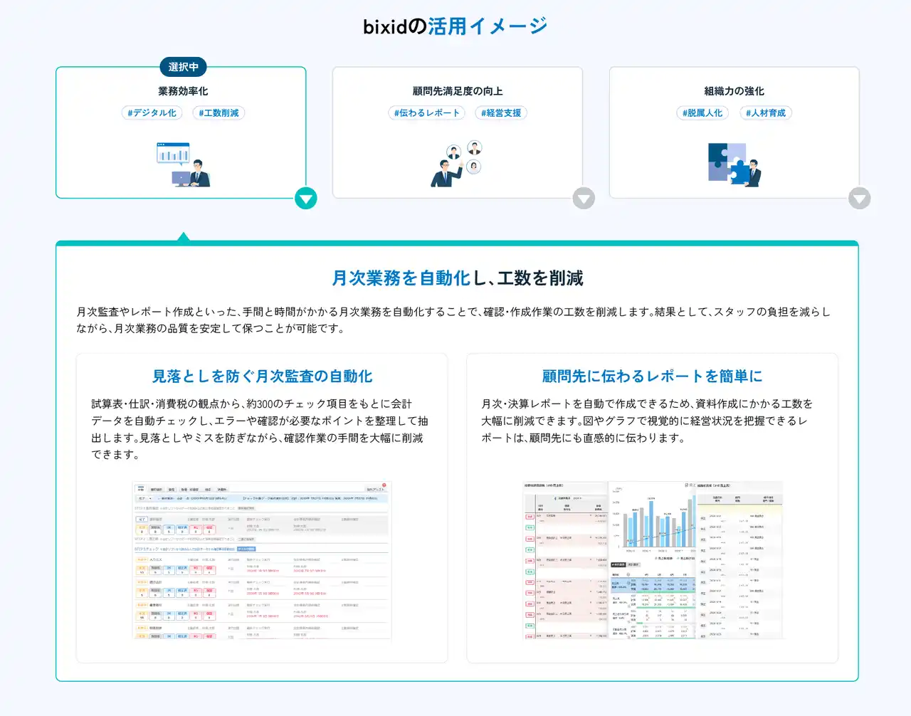 従来の全体像は機能を中心とした構成でしたが、本リニューアルでは会計事務所の業務の流れに沿ってbixidの全体像を再設計しました。月次監査・月次報告・計画作成といった業務単位で活用方法と価値を整理することで、「何ができるか」だけでなく「どのように業務に活かせるか」が直感的に理解できる構成へと刷新しています。 |