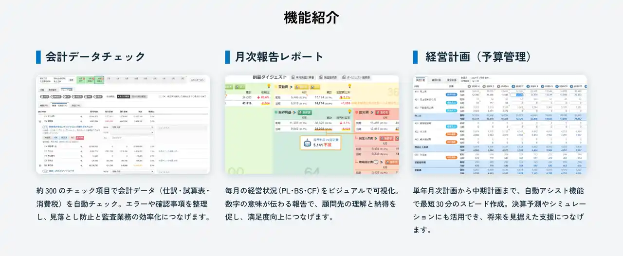 会計データチェック、月次報告レポート、経営計画などの主要機能について、会計事務所の業務とのつながりを意識して整理しています。「どの業務で」「どのように活用されるか」を軸に構成することで、監査業務の効率化や月次報告の価値向上、経営支援の高度化といった活用イメージを具体的に伝えています。 |