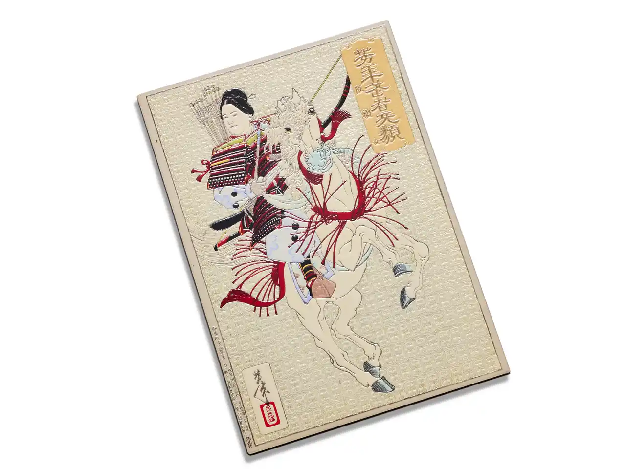 | 浮世絵師・月岡芳年による、歴史上の武将を題材とした武者絵シリーズ「芳年武者旡類」の一作です。日本史において数少ない女性武将であり、弓の名手として知られる板額御前のりりしい姿が描かれています。激しい動きに合わせて大きく揺れる馬のたてがみや、首元の赤いふさに凹凸を施し、風を切るようなスピードや戦場の緊張感が伝わるように仕上げました。指先でなぞることで、板額御前の圧倒的な存在感をより強く感じていただけます。 | |||