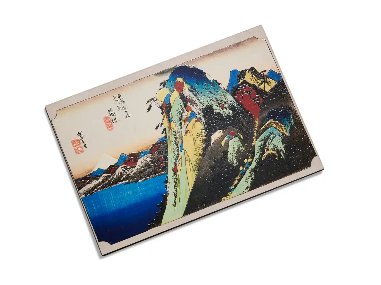 | 歌川広重の浮世絵「東海道五十三次」の中でも、東海道最大の難所といわれた箱根越えを描いた一作です。箱根・芦ノ湖を望む風景の中で、色とりどりに重なる山々の表情が印象的に描かれています。カラフルな山の色彩が美しく映えるよう全体のバランスを整え、奥に見える富士山は白いシルエットのまま凹凸を加え、その輪郭を際立たせました。シンプルな表現の中にも、富士山の確かな存在感が伝わるよう仕上げています。 | |||