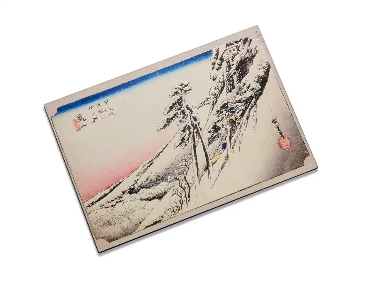 | 歌川広重による雪景の代表作です。冬の朝の澄んだ空気と、朝焼けに染まり始める空の描写、白と黒のモノトーンで広がる銀世界が印象的に描かれています。雪が降り止んだ朝の清々しい空気感をイメージし、一面がきらめくように明るく、それでいて静けさに満ちた景色を表現しました。あえて凹凸を控えめにすることで、しんと張り詰めた雪国の雰囲気を引き出しています。静かな日本の美しさが、ポストカードの中でやわらかく広がる一枚に仕上げています。 | |||
