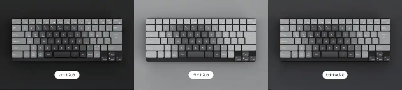 FMVキーボードマイスター監修の3種類のアクチュエーションプリセットを搭載しています。「ライト入力設定」では軽い力で素早く入力、「おすすめ入力設定」ではFMVノートパソコンと同様の押下圧、「ハード入力設定」では深く押し込んで確実に入力と、お好みの打鍵感をお選びいただけます。 |
