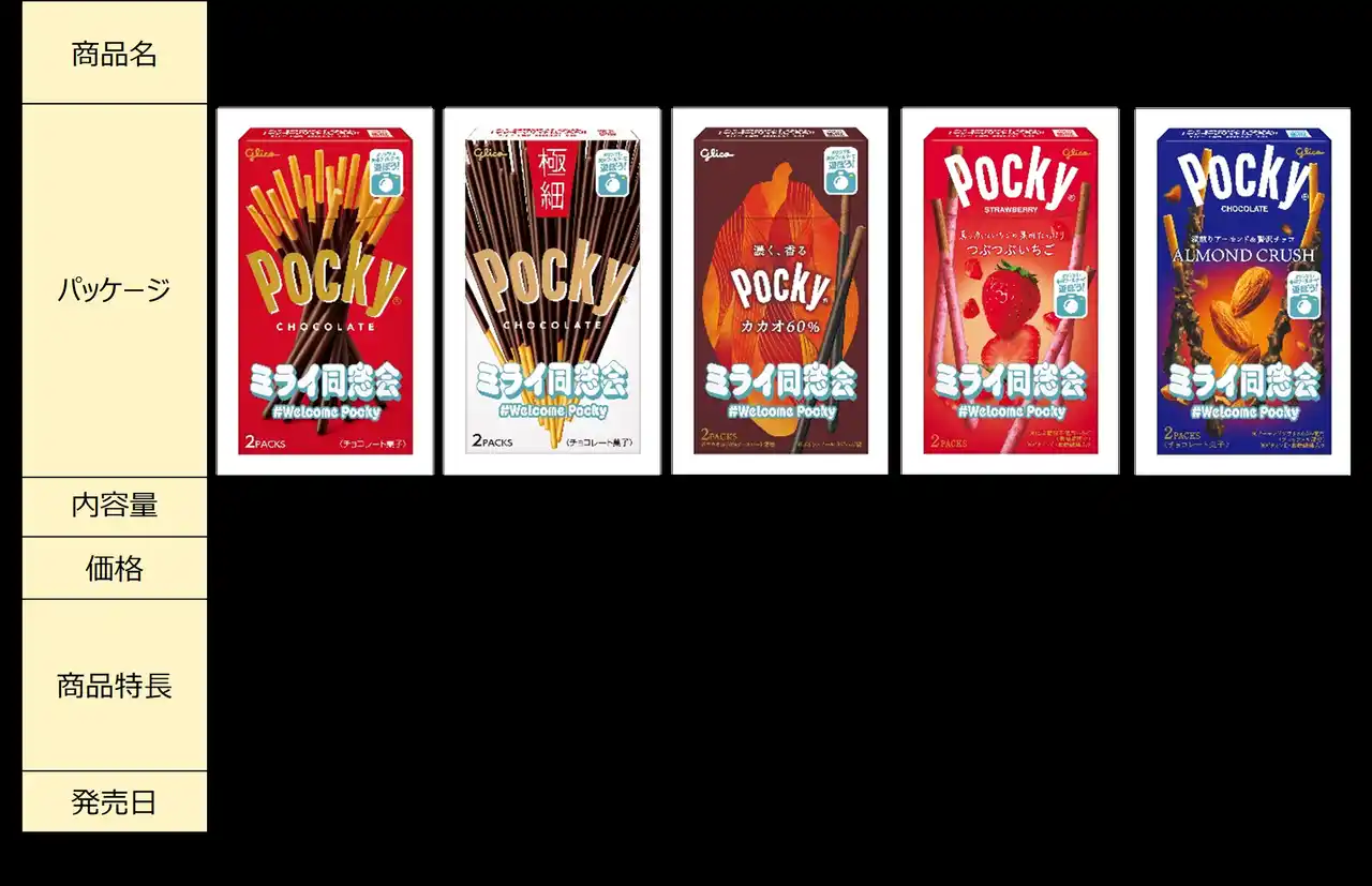 | 以下の#Welcome Pocky「ミライ同窓会」のキャンペーンマークが入った、限定パッケージ商品のみが対象です。 | |||||||||||