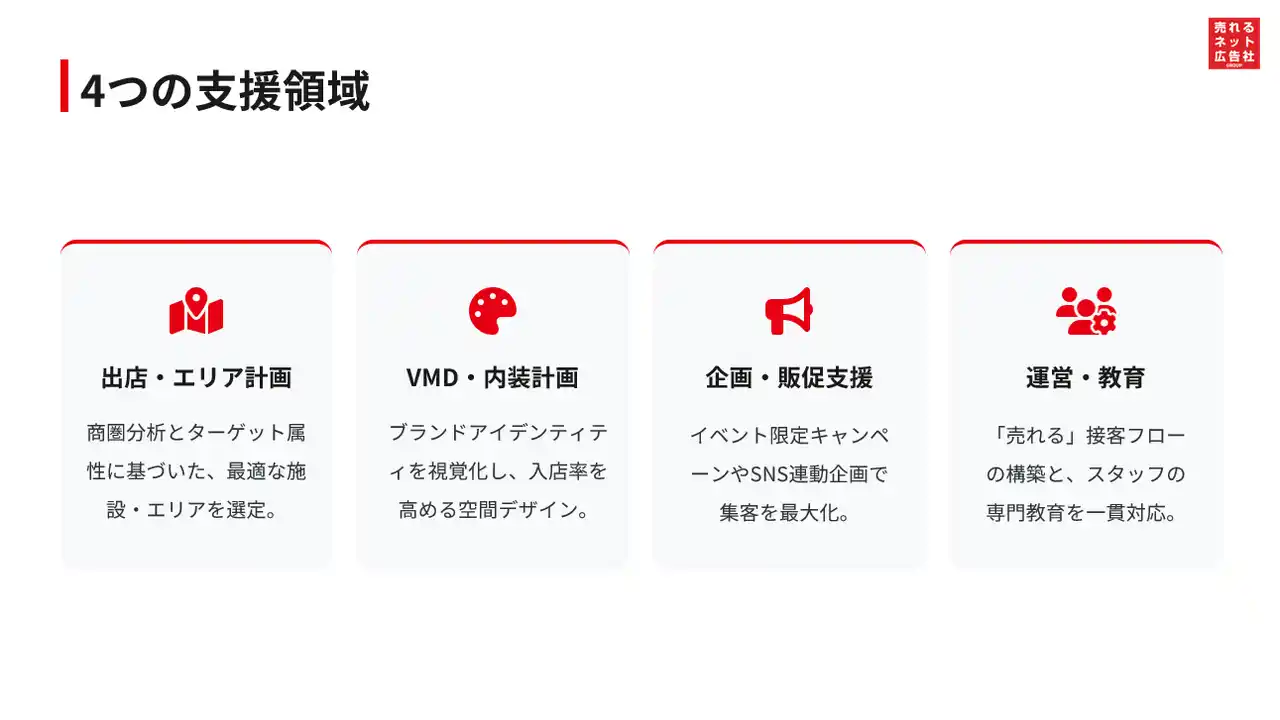 加えて、「売れる」接客フローの構築およびスタッフ教育、現場オペレーションの整備までを一貫して支援し、現場における販売力の最大化を図ります。 |