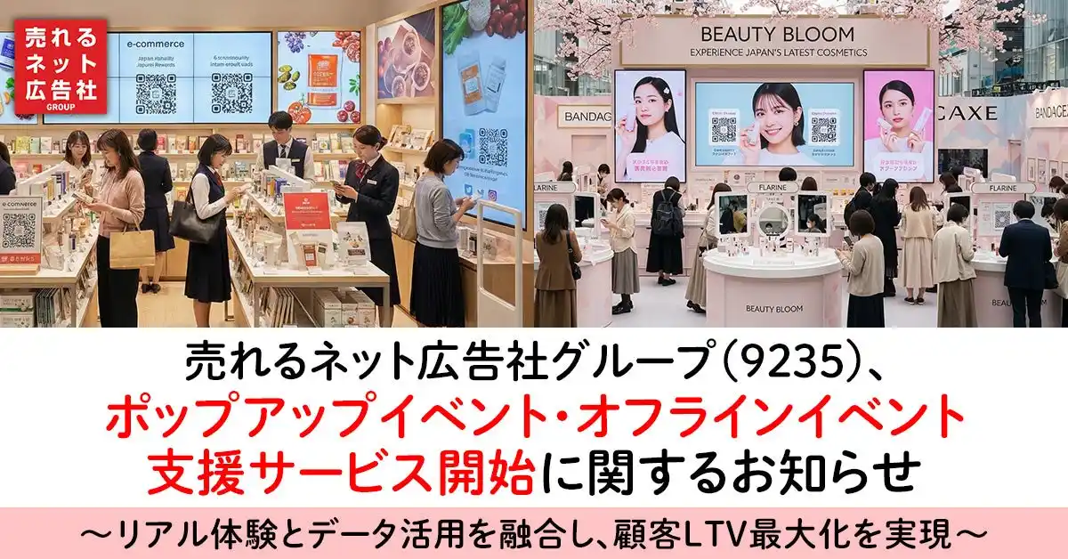 売れるネット広告社グループ株式会社(本社:福岡県福岡市、代表取締役社長 CEO:植木原宗平、東証グロース市場:証券コード9235、以下「当社」)の連結子会社である売れるネット広告社株式会社は、このたびD2Cブランド向け新サービス「ポップアップ・オフラインイベント支援サービス」を開始いたしましたので、お知らせいたします。 |