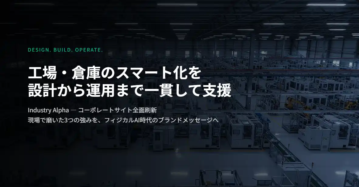 新コーポレートサイト(https://www.industryalpha.net)は、「Design. Build. Operate.」をコンセプトに、当社が描くスマート化の世界観を体現するデザインで構築されています。単なる製品カタログではなく、お客様が自社の現場の未来像を想像できるサイトとして設計しました。 |