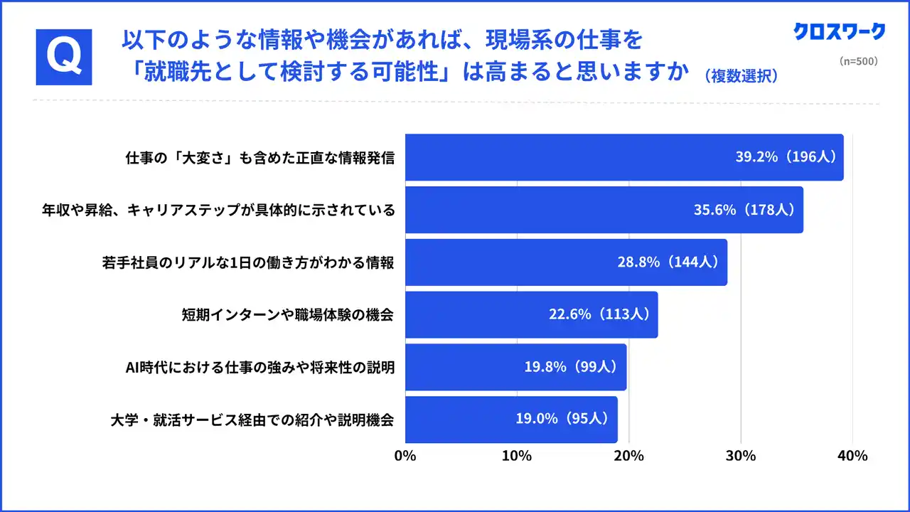 どのような情報や機会があれば現場系の仕事を就職先として検討するかを尋ねたところ、仕事の大変さも含めた正直な情報発信39.2%(196名)が最多となりました。次いで年収や昇給、キャリアステップの具体的な提示35.6%(178名)、若手社員のリアルな1日の働き方がわかる情報28.8%(144名)が続いています。 実態を正しく見せることが、潜在的な現場志望層を掘り起こす鍵となることが示唆されました。 |