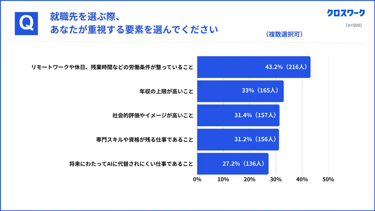 就職先選択においては、リモートワークや休日、残業時間など、労働条件の整備を重視する学生が最も多く、43.2%(216名)でした。 |