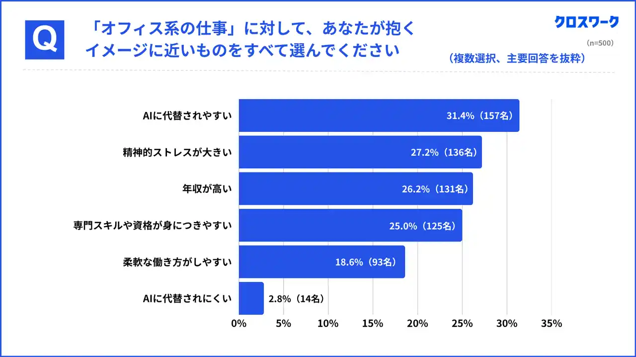 職種に対するイメージを尋ねたところ、オフィス系の仕事では「AIに代替されやすい(31.4%、157名)」が最多となりました。AIに代替されにくいを選んだ人は最下位と、時代を反映する結果となりました。次いで「精神的ストレスが大きい(27.2%、136名)」、「年収が高い(26.2%、131名)」が続いています。 |