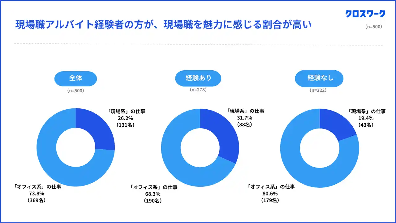 今回の調査対象者500名のうち、「現場系・ノンデスクワーク」アルバイトの経験者は 278名でした。 |