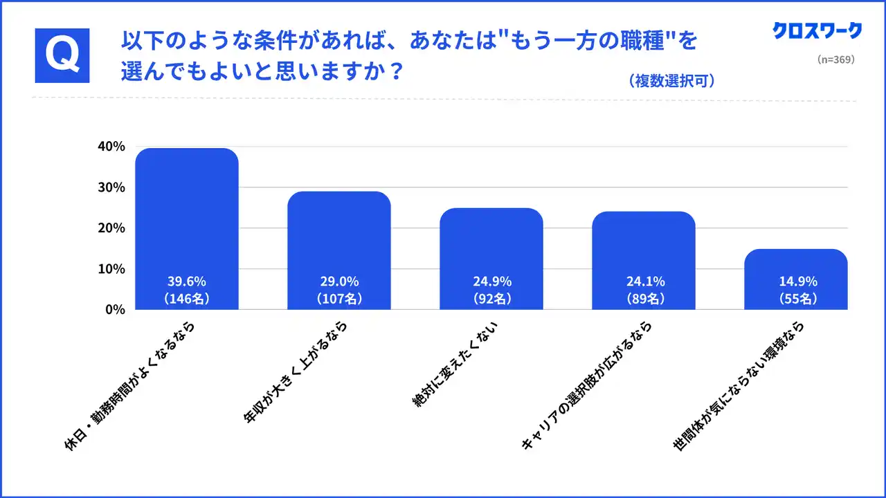 具体的な条件としては、休日や勤務時間などの条件がよくなるなら39.6%(146名)が最多となり、次いで年収が大きく上がるなら29.0%(107名)、キャリアの選択肢が広がるなら24.1%(89名)、世間体が気にならない環境なら14.9%(55名)という順になりました。 |