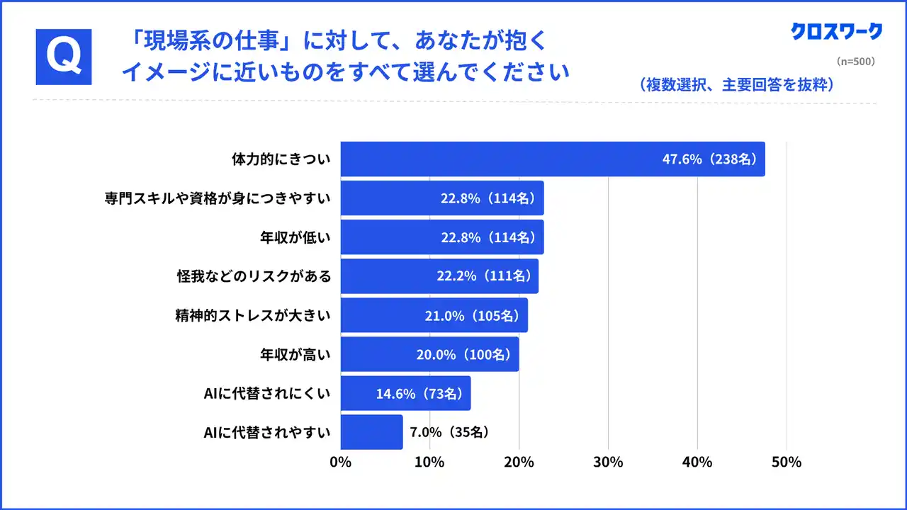 一方で、現場系の仕事は「体力的にきつい(47.6%、238名)」という懸念が最も多く見られました。「専門スキルや資格が身につきやすい(22.8%、114名)」が続き、年収に対してのイメージは「高い(100名)」と「低い(114名)」が拮抗しました。 |