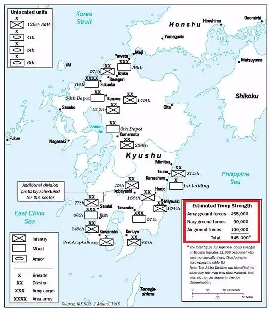 米軍が解読した暗号情報によれば、Wikipedia英語版(下図)にあるように、最初の上陸予定地である九州には、1945年7月時点で50万人を超える日本軍が集結。さらに「根こそぎ動員」による民間人兵士、1万機規模の特攻機も用意されていたと推定されています。 |
