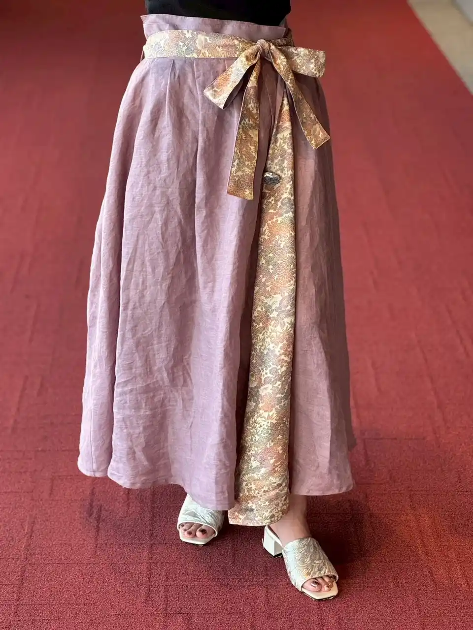 新作として登場するラップスカートは、リネン素材をベースに、着物のエッセンスをさりげなく取り入れた華やかな一着。使用する着物や帯により異なる表情を持つ、世界にひとつだけの一点ものアイテムが揃います。 |