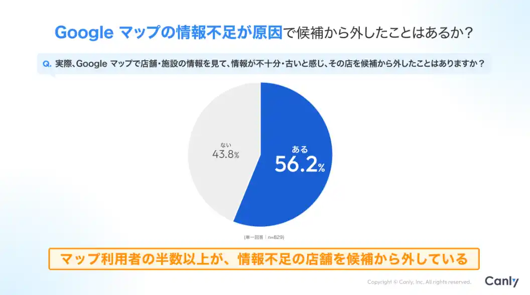 | さらに、せっかくお店に興味を持ってもらえても、マップ上の店舗情報が手つかずのままだと、半数以上の方がお店に行く前に候補から外してしまう可能性も見えてきました。 | ||||||||||
