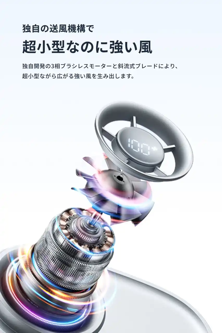 独自開発の3相ブラシレスモーターとタービンブレード(羽根)により、超小型ながら広がる強い風を生み出します。 |