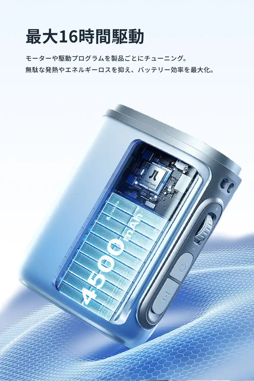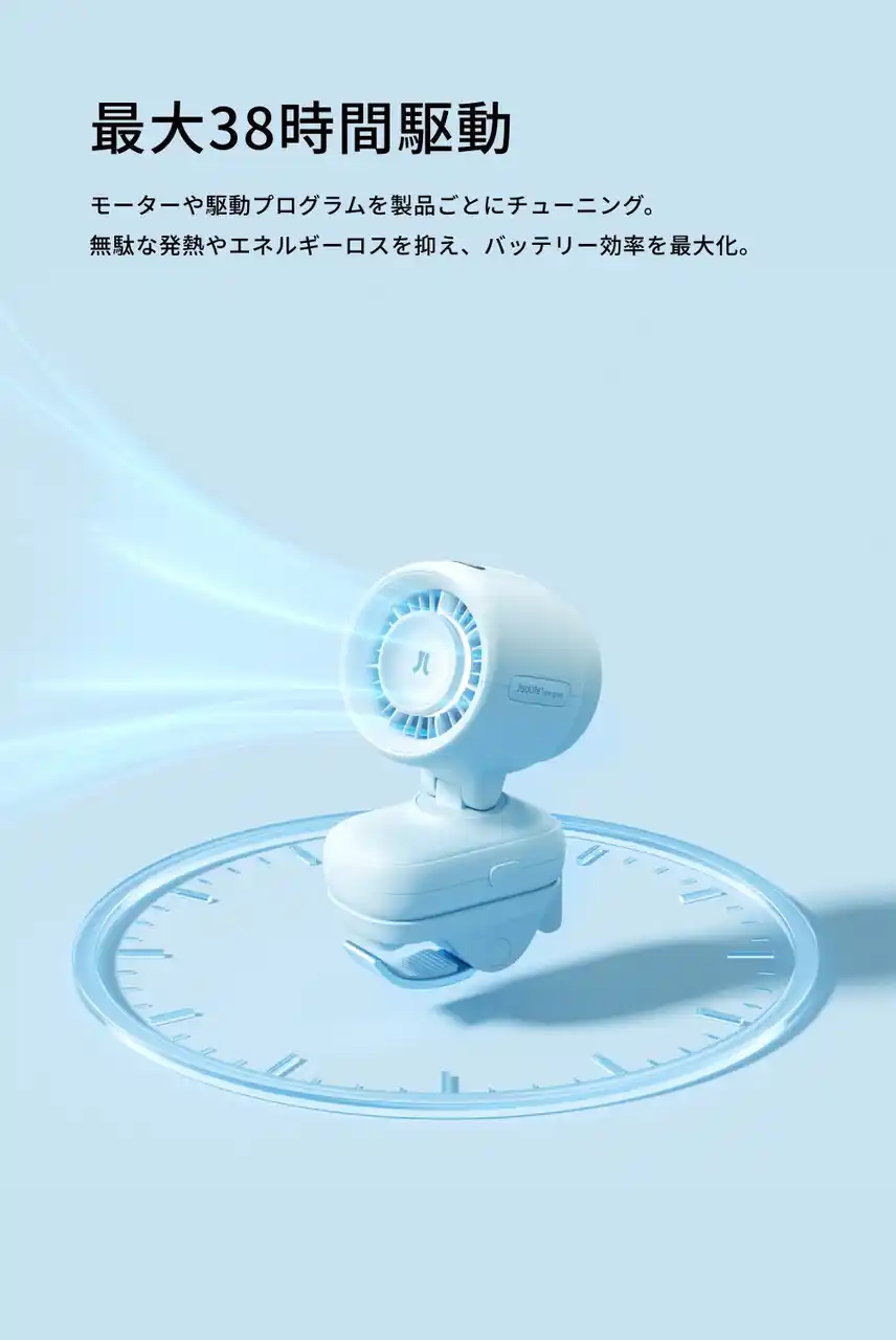 製品ごとに異なる羽根の空気抵抗に合わせて、モーターや駆動プログラムを個別にチューニング。無駄な発熱やエネルギーロスを抑え、バッテリー効率を最大化。 |