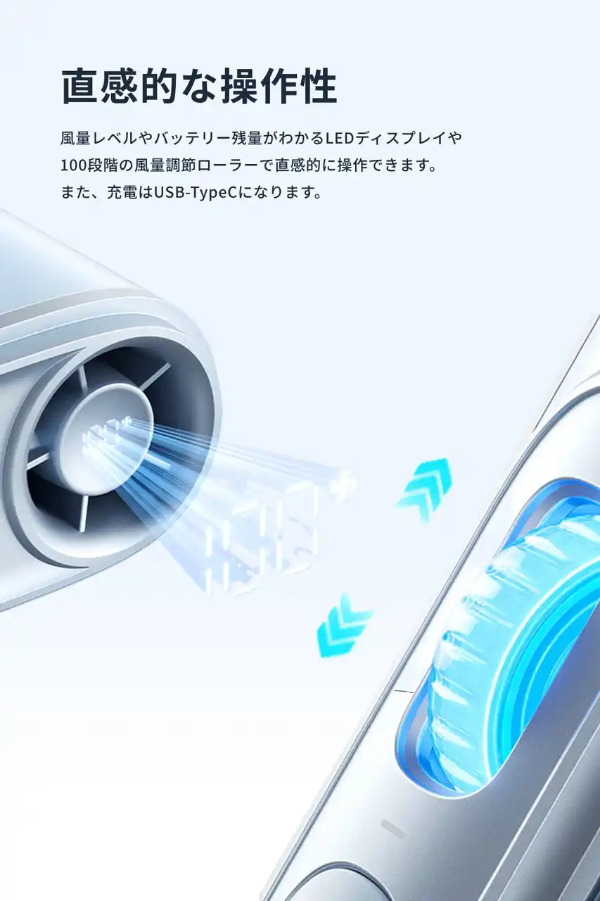 風量レベルやバッテリー残量がわかるLEDディスプレイや100段階の風量調節ローラーで直感的に操作できます。また、充電はUSB-TypeCになります。 |