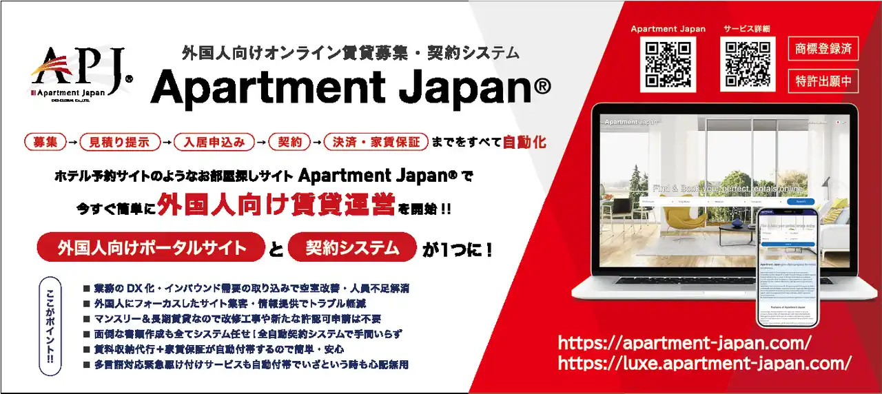 DID-GLOBAL株式会社が運営する「Apartment Japan(R)」および高級賃貸サイト「Apartment Japan-Luxe」は、外国人が来日前から物件検索・申込・契約・決済までをオンラインで完結できる、日本初の外国人向け賃貸DXプラットフォームです。 外国人フレンドリーな条件(1ヶ月以上及び1年以上の中長期契約、保証人不要、クレジット決済対応)で外国人に解りやすい方法で全国の物件情報を掲載し世界に向けて発信するオンライン賃貸ポータルです。 |
