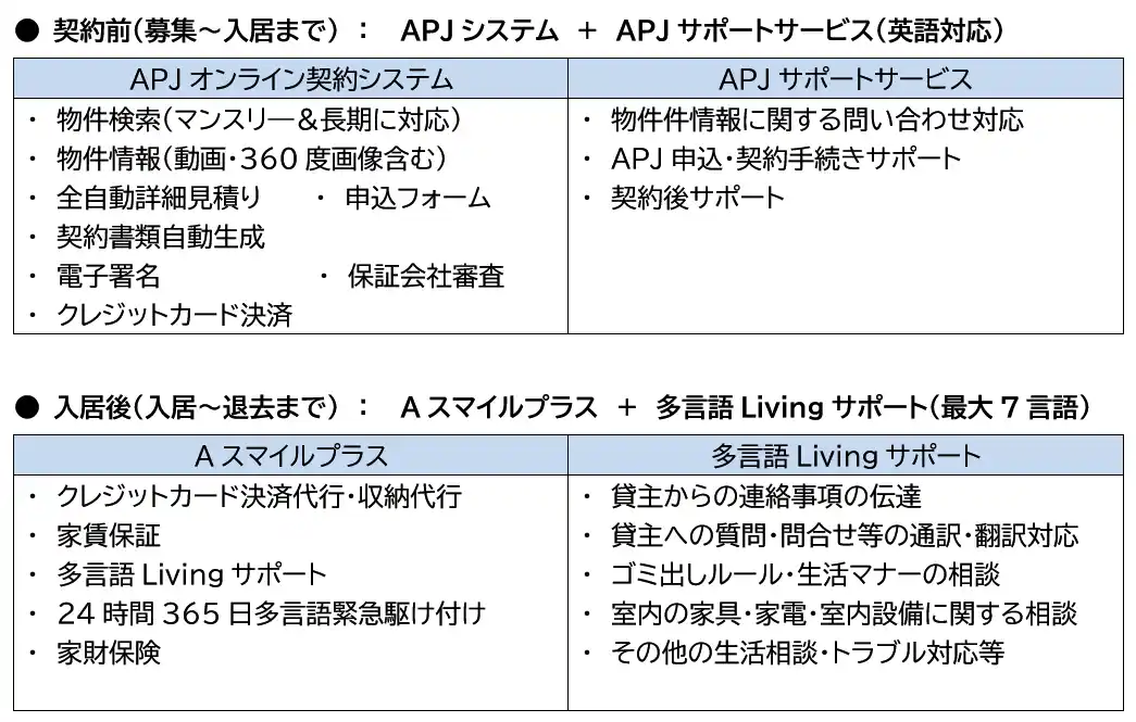 Apartment Japan(R)の提携家賃保証に自動付帯「多言語Livingサポート」サポート内容 |