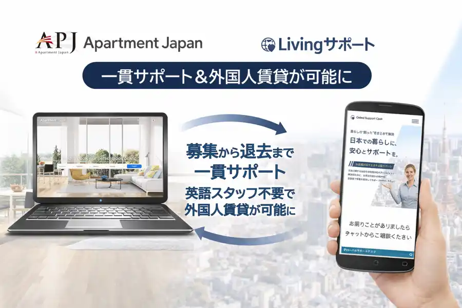 外国人向け賃貸検索・契約サイト「Apartment Japan(R)(アパートメントジャパン、以下「APJ 」)」を運営するDID-GLOBAL株式会社(本社:大阪市中央区、代表取締役:近藤暁子、以下「DID-GLOBAL」)は、業務提携先のアイ・シンクレント株式会社(以下iTR)がAPJに提供する家賃保証サービス「Aスマイルプラス」において、Renxa株式会社(本社:東京都豊島区 代表取締役:坂本幸司、以下「Renxa」)が提供する多言語生活サポートサービス「Global Support Desk(グローバルサポートデスク)」と業務連携をおこない、外国人向け多言語コールセンターサービス 『多言語Livingサポート』 として、2026年4月1日よりAPJに自動付帯された新たなサービスとして提供を開始したことをお知らせいたします。 |