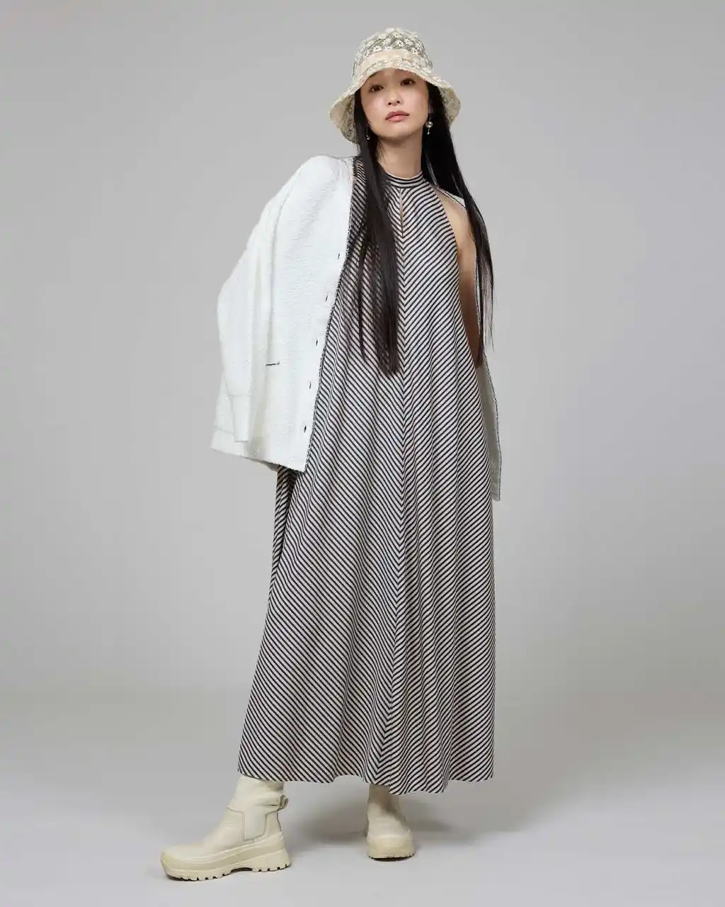 Cardigan ¥57,200 / Dress ¥82,500 / Earrings ¥51,700 / その他 私物 |