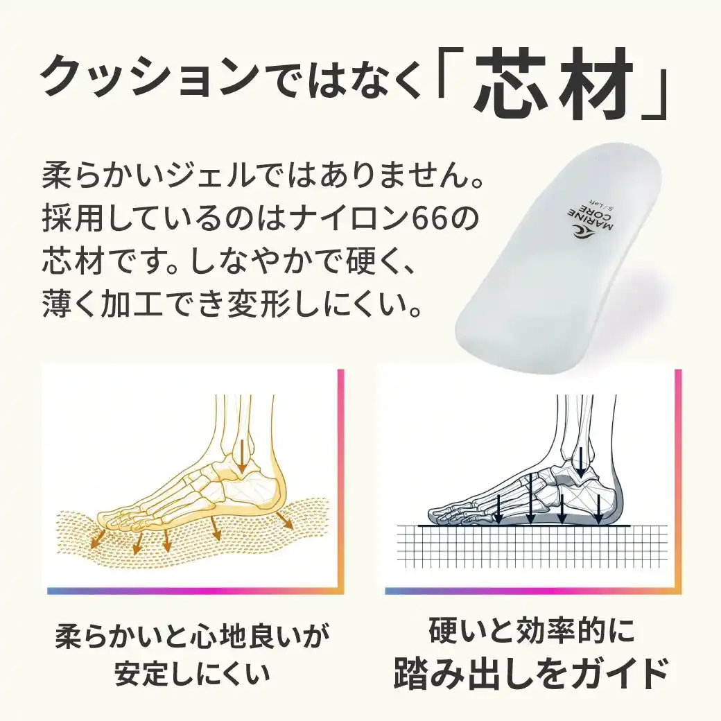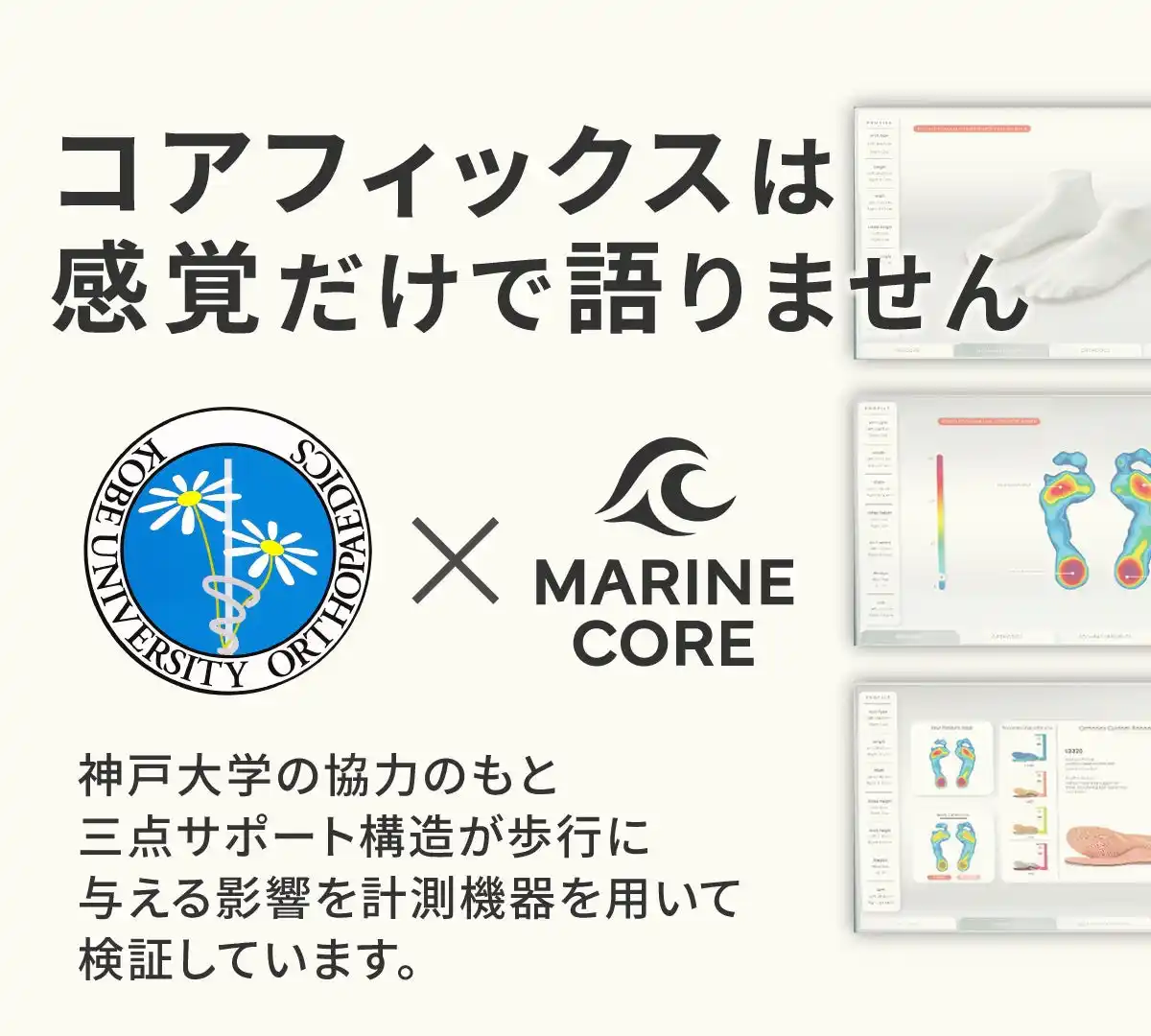 「MARINE CORE」は、単なるクッション性の高いインソールではありません。国際特許を出願した独自の技術と、神戸大学医学部整形外科との共同研究データに基づき、身体の「軸」を正しく整えることを目的に設計されました。 |