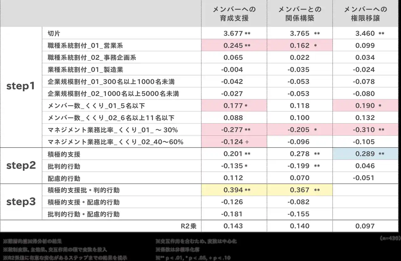 ・メンバーの批判的行動は、メンバーからの積極的支援の認識が高い場合には、管理職の成果実感にポジティブな影響を与える傾向が見られた。 |