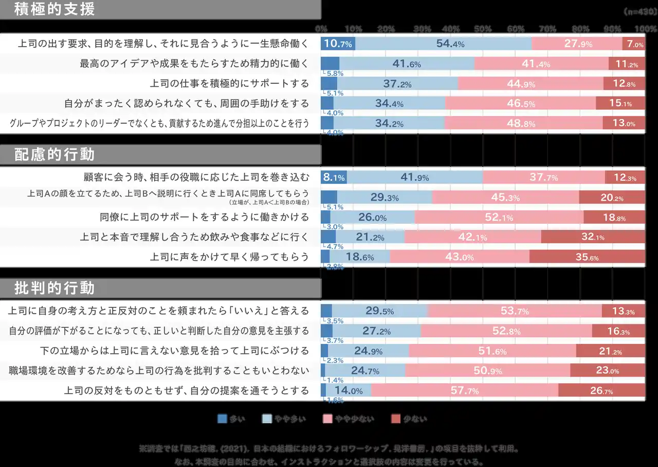 ・一方で、「下の立場からは言えない意見を拾って上司に伝える」「自分の評価が下がることになっても正しいと思う意見を主張する」「職場環境を改善するために上司の行為を批判する」といった批判的行動については、肯定的回答が3割程度にとどまり、上司に対して異議を唱える行動は相対的に少ないと認知している傾向が見られる。 |