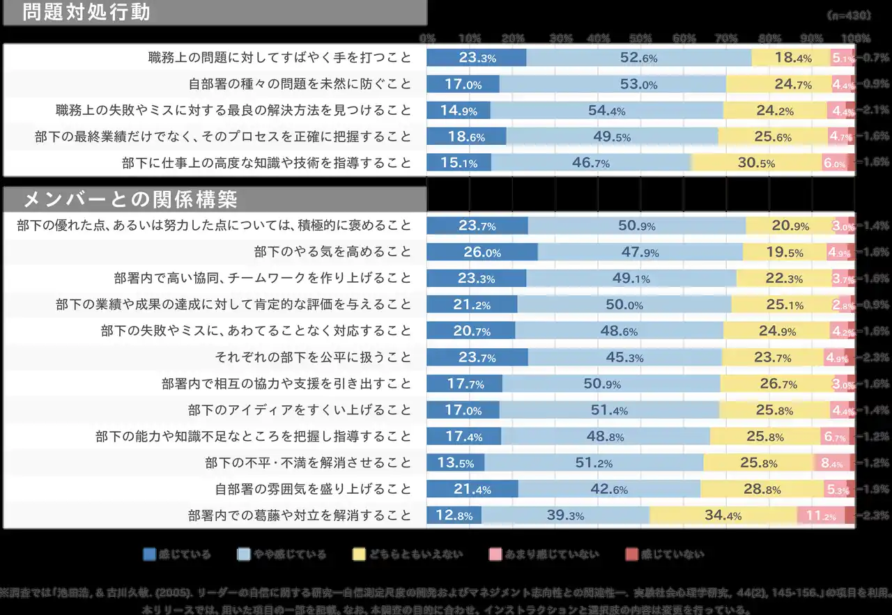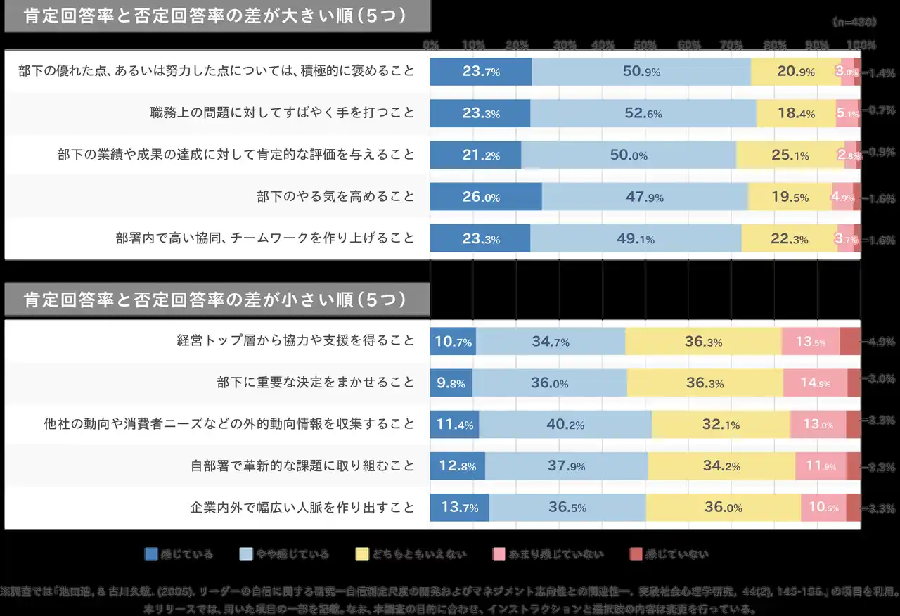 ・また、「部下に重要な決定を任せる」といった権限委譲に関する行動についても、肯定的回答の割合が比較的低く、部下への意思決定の委任は十分にやりがいを感じられていない可能性が示唆される。 |