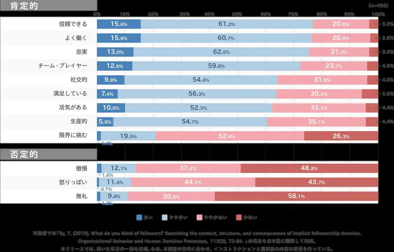 ・一方で、「傲慢」「怒りっぽい」「無礼」といった否定的なイメージについては、「少ない」「やや少ない」と回答した割合が高く、ネガティブな印象は比較的弱い結果となった。 |