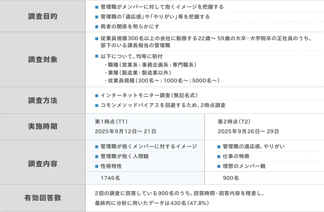 本調査では、管理職がメンバーをどのように認識しているかが、管理職自身のマネジメント行動や心理状態にどのように関連しているかについて調べました。 |