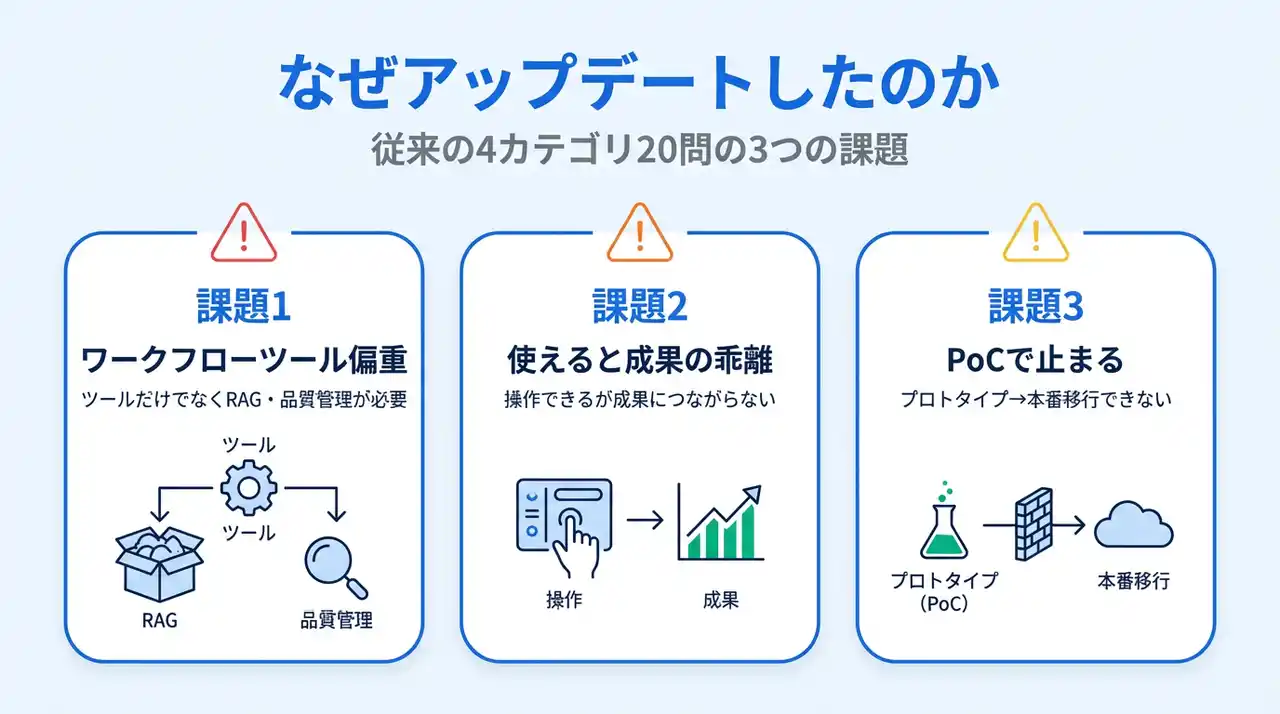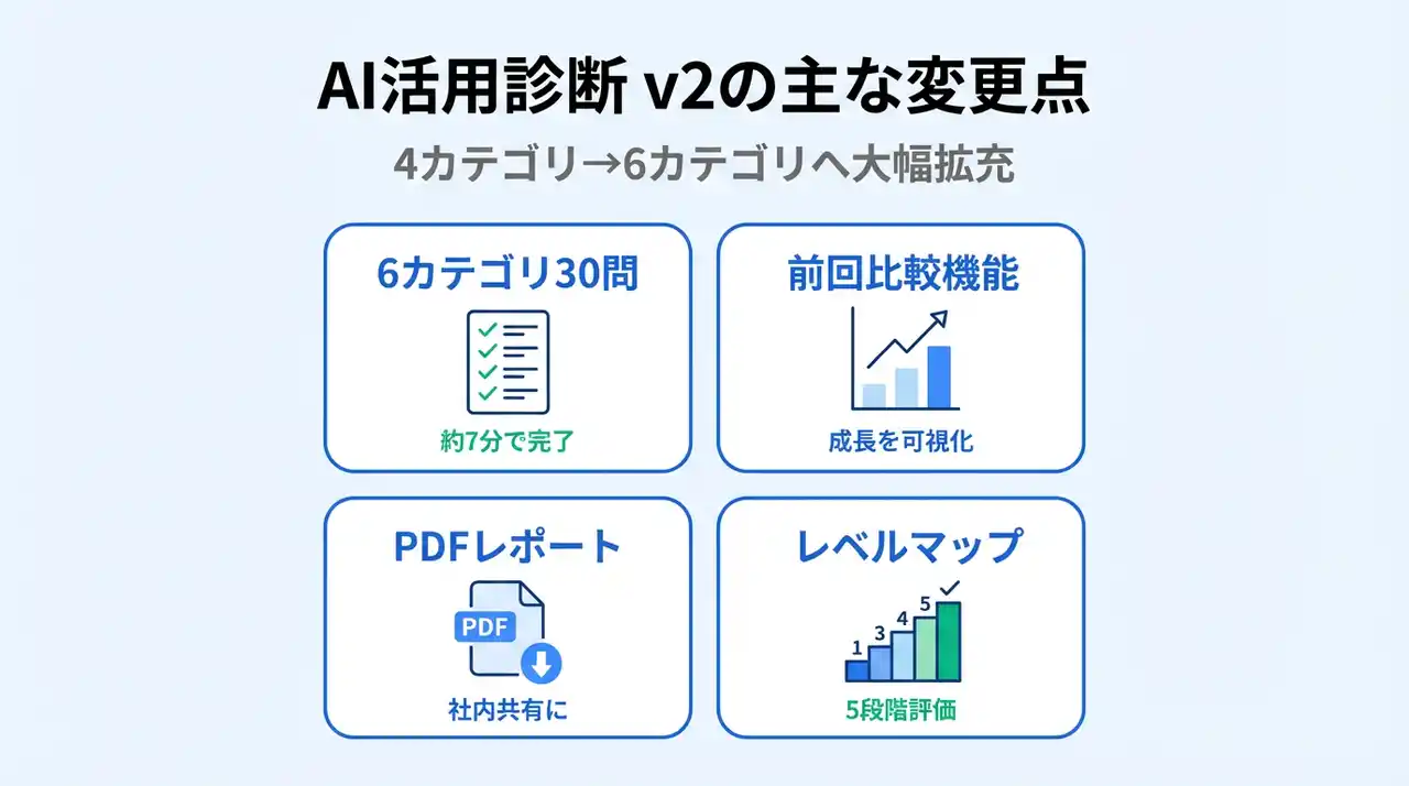 2025年のリリース以来、多くの方にご利用いただいてきた「AI活用診断」。当社ブログ(119記事)の分析と、10ヶ月以上にわたるクライアント企業でのAI研修・推進支援の知見から、従来の4カテゴリ20問では現場で本当に求められるAIスキルを評価できないことが明らかになりました。 |