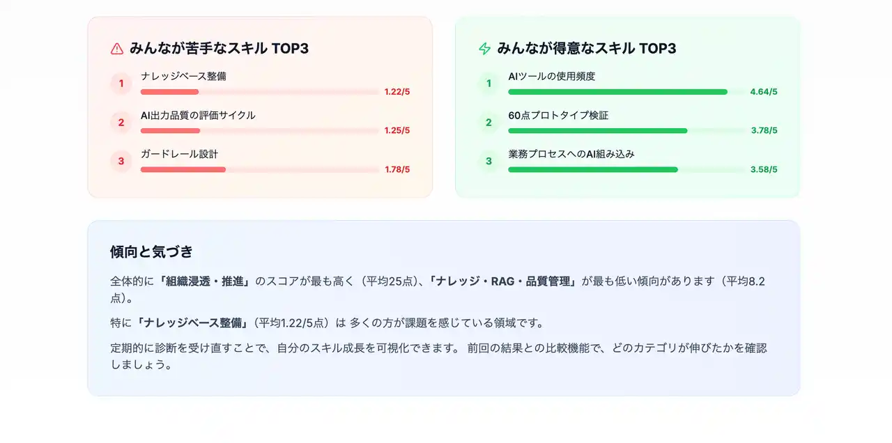 苦手スキルTOP3: ナレッジベース整備(平均1.11/5)、AI出力品質の評価サイクル(平均1.14/5)、ガードレール設計(平均1.69/5) |