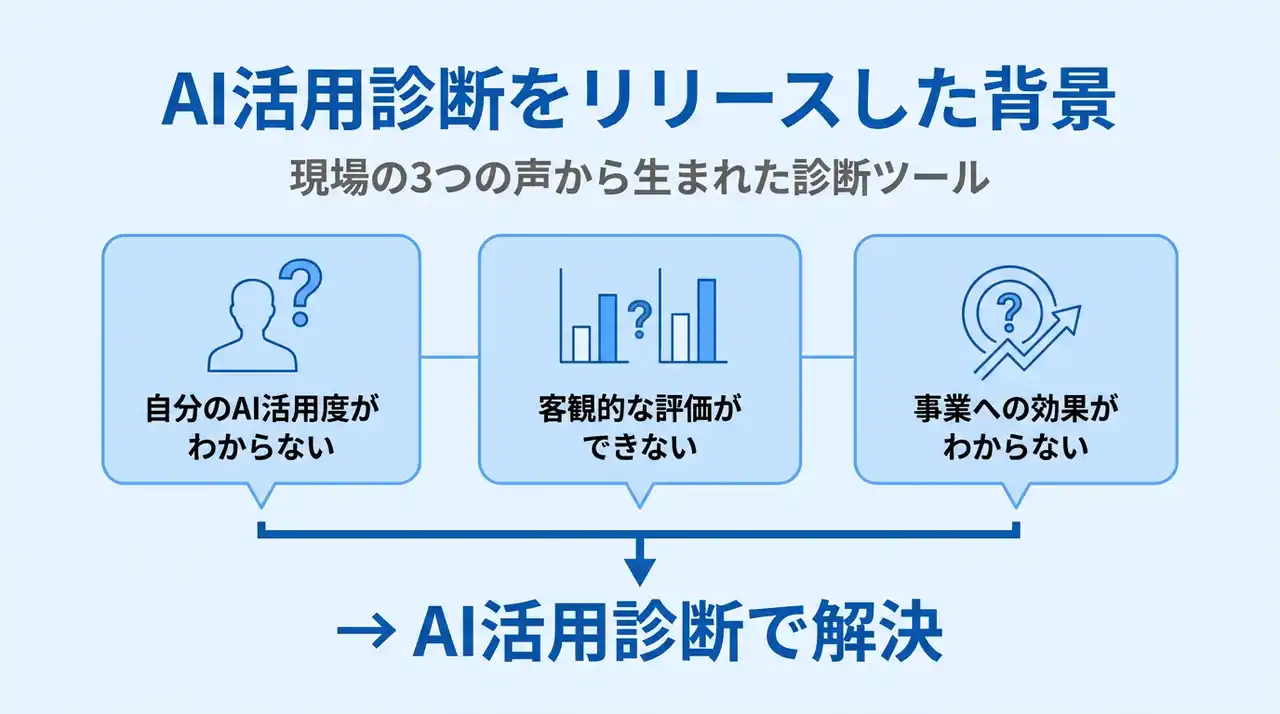 これらの声に応えるために、個人が自分のAIスキルを客観的に可視化し、次に何を学ぶべきかがわかる診断ツールとして「AI活用診断」を開発・リリースしました。 |